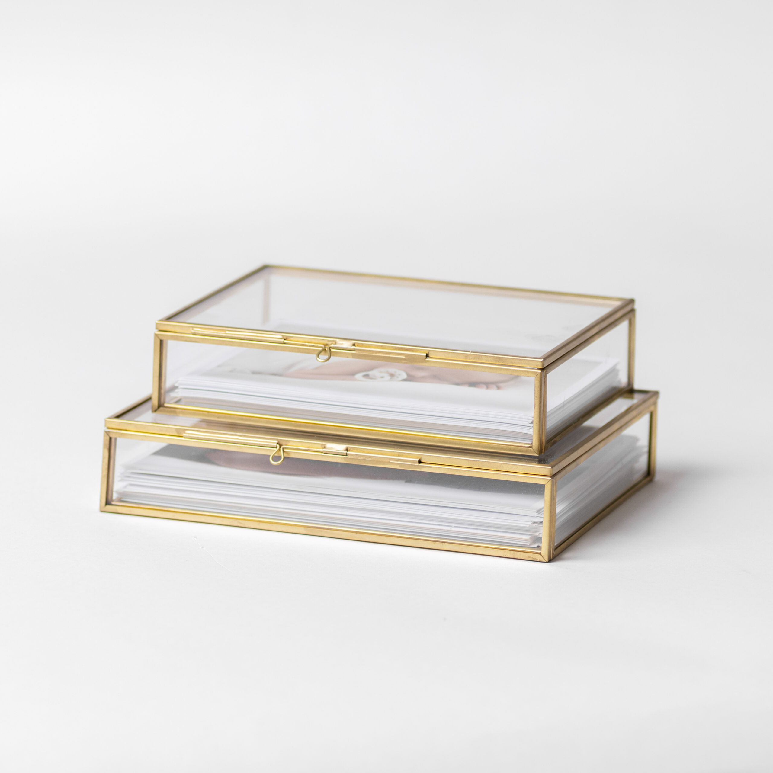 Conservez vos tirages photo avec élégance dans notre boîte en verre et laiton doré. Raffinée et moderne, elle allie transparence et finition métallique pour mettre en valeur vos souvenirs.